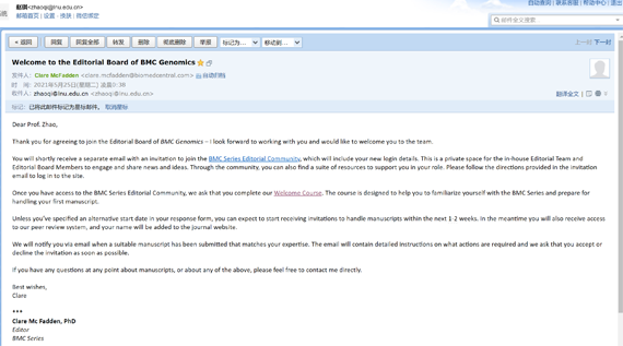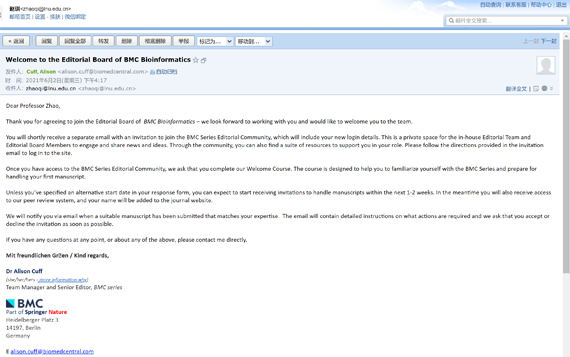 近日,乐动在线-乐动(中国)计算机与软件工程学院教授赵琪收到BMC出版集团Dylan Smith博士邀请,受邀分别担任BMC Genomics和BMC Bioinformatics编委。