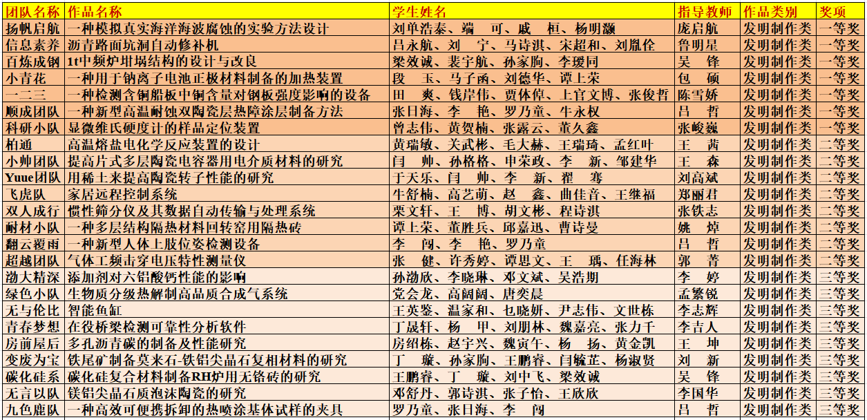自2月22日启动以来,大赛得到了广大教师和本科生以及硕、博士研究生的支持与鼓励,共收到来自材冶、土木、电信、化工、管理、矿业、机械、经法、建艺、国际、计软11个学院的参赛作品百余件。经组委会初评、决赛答辩等环节,最终评选发明制作类奖项24项,其中一等奖7项、二等奖8项、三等奖9项;工艺改进类奖项33项,其中一等奖10项、二等奖11项、三等奖12项;创新设计类奖项24项,其中一等奖7项、二等奖8项(含生活创意类1项)、三等奖9项;创业类奖项15项,其中一等奖4项、二等奖5项、三等奖6项。
