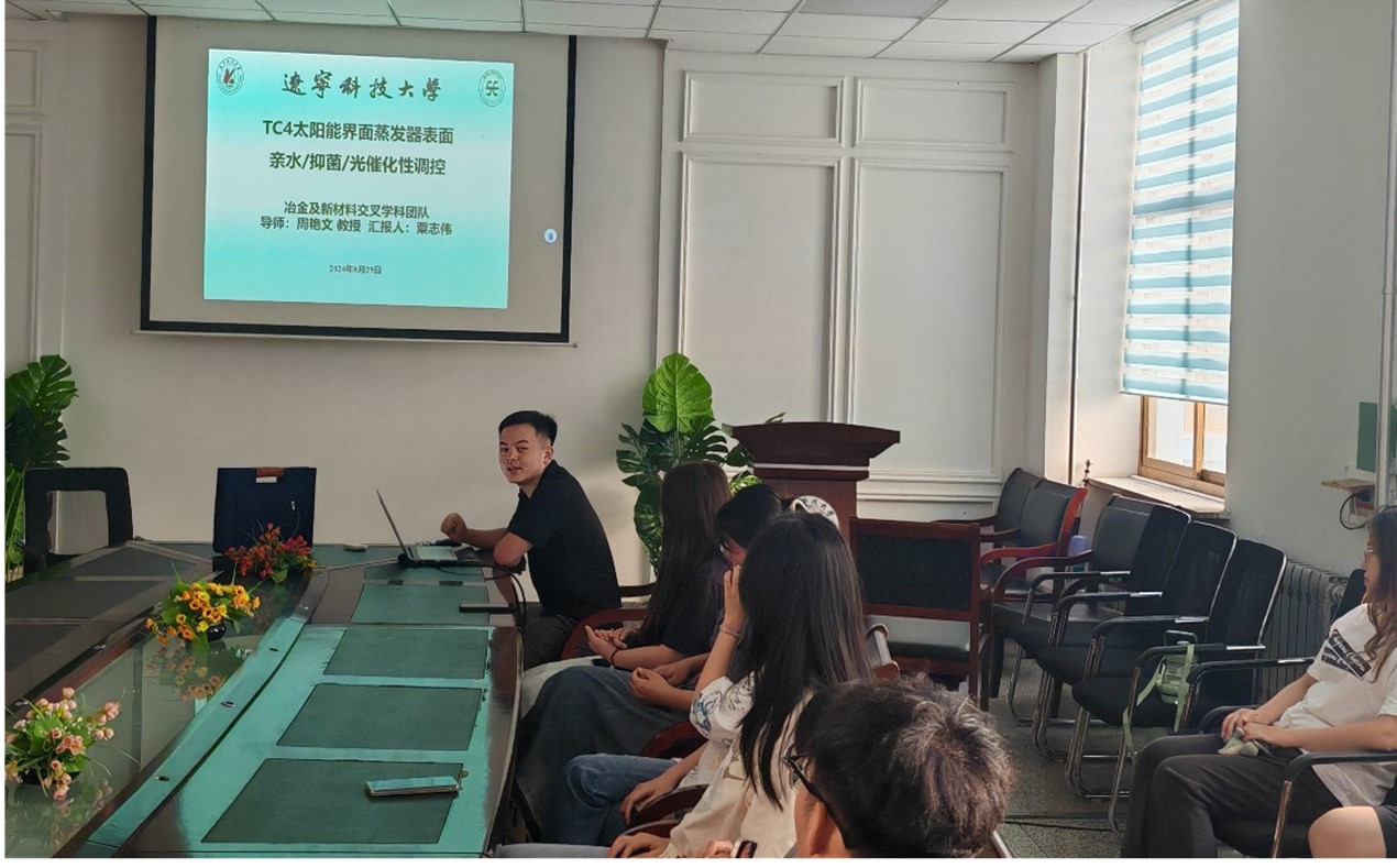 粟志伟博士报告主题为“TC4太阳能界面蒸发器表面的亲水/抑菌/光催化性调控”,主要分享了自己目前的科研成果:在TC4钛合金作为蒸发器基板上复合薄膜,探究在金属基太阳能界面蒸发器表面使用磁控溅射复合TiO2功能性薄膜的可行性及工艺稳定性。同时探讨了复合表面在实际应用环境中的亲水时效,抗生物污损性。