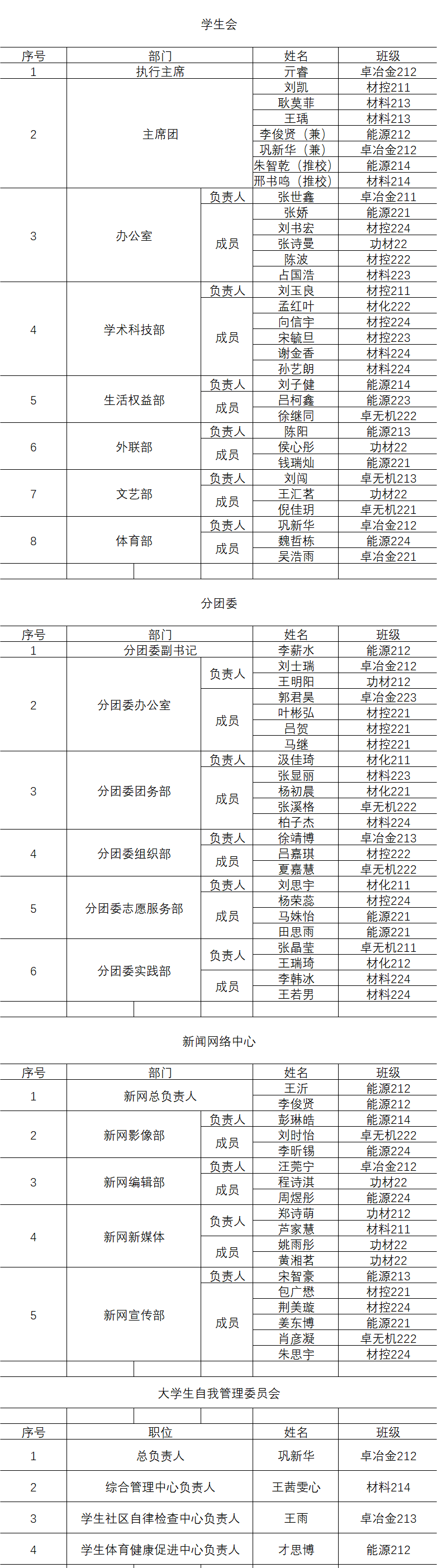 为进一步加强学院学生管理工作建设、增强学生组织的凝聚力和向心力、督促学生自我勉励、创造更好的学院氛围,拟定亓睿等77名同学为乐动在线-乐动(中国)材料与冶金学院第十四届团委、学生会、新闻网络中心、自我管理委员会成员。