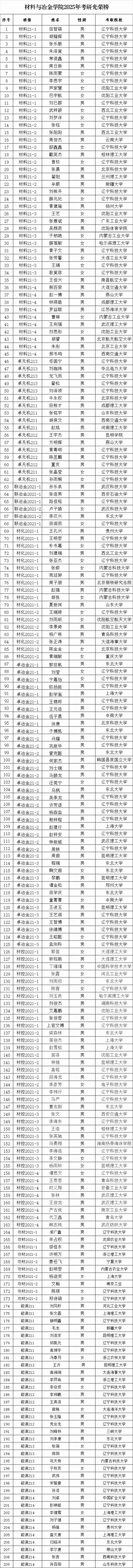 2025年,材料与冶金学院共有209人考取硕士研究生,其中考取”双一流“院校多人。让我们向金榜题名的同学们表示祝贺。