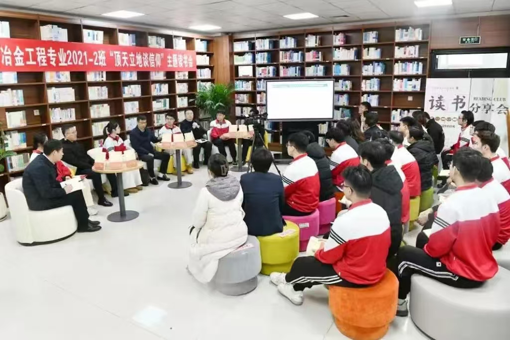 冶金工程专业2021-2班学生代表刘士瑞、汪莞宁、马腾龙、巩新华、亓睿围绕阅读《顶天立地谈信仰——原来党课可以这么上》一书,并结合自身学习、生活和参加学生活动实际畅谈心得体会。辽宁省辅导员年度人物、材料与冶金学院辅导员宋广强和高朋敏,结合自身从事辅导员工作和担任学生党支部书记的工作经历,围绕“顶天立地谈信仰”这一主题开展分享读书分享,勉励同学们坚定理想信念,争做国家栋梁。
