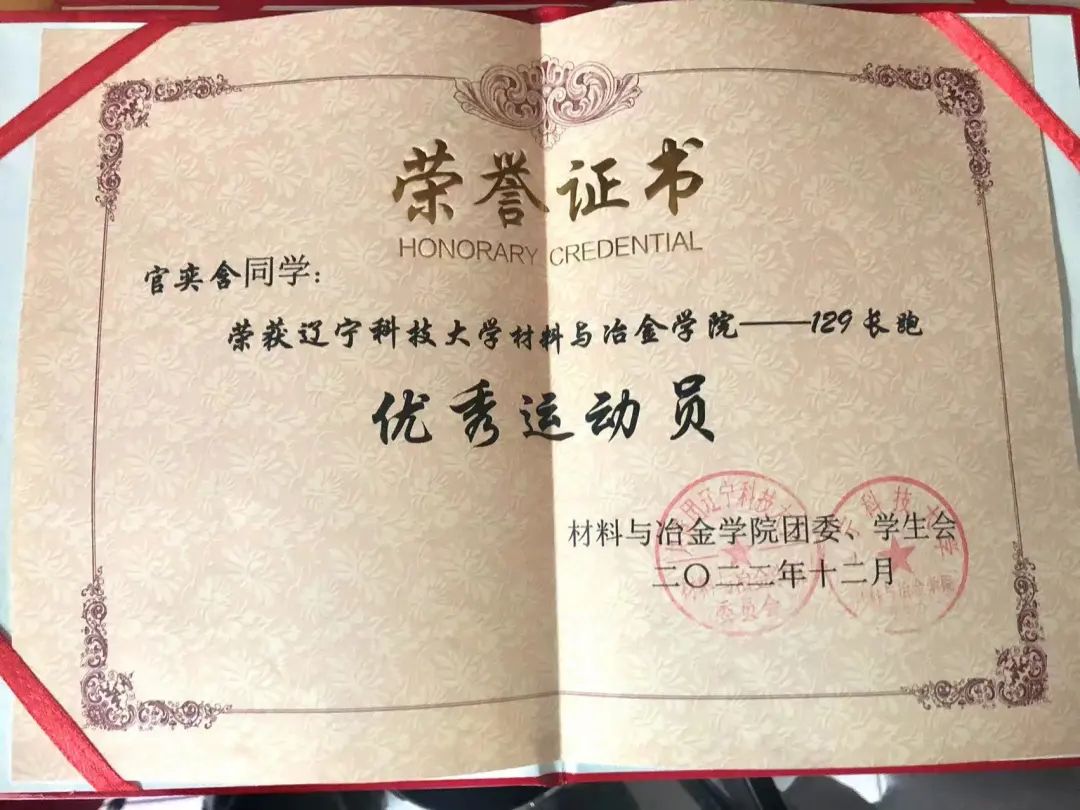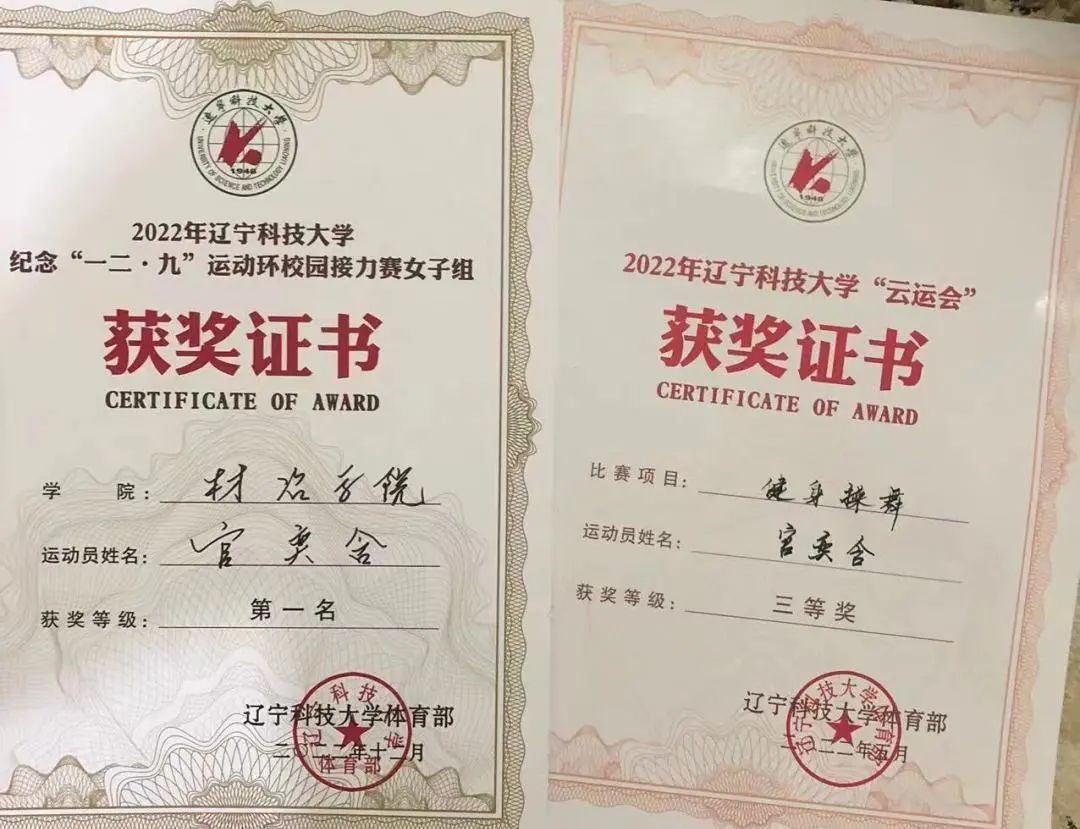 2022年:乐动在线-乐动(中国)清明4.5千米接力环跑校级一等奖、乐动在线-乐动(中国)云运会健美操比赛校级第四名、乐动在线-乐动(中国)纪念“一二·九”运动环校园接力赛女子组校级第一名、乐动在线-乐动(中国)材料与冶金学院129长跑优秀运动员
