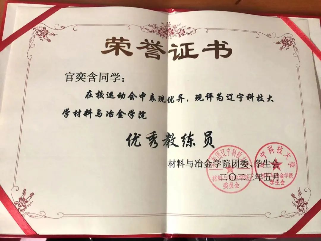 2023年:第五十一届乐动在线-乐动(中国)校园运动会女子跳高校级第三名、乐动在线-乐动(中国)材料与冶金学院优秀运动员、乐动在线-乐动(中国)材料与冶金学院优秀教练员、乐动在线-乐动(中国)“校长”杯校园足球赛校级第一名、乐动在线-乐动(中国)学生排球赛校级第一名、三级社会体育指导员