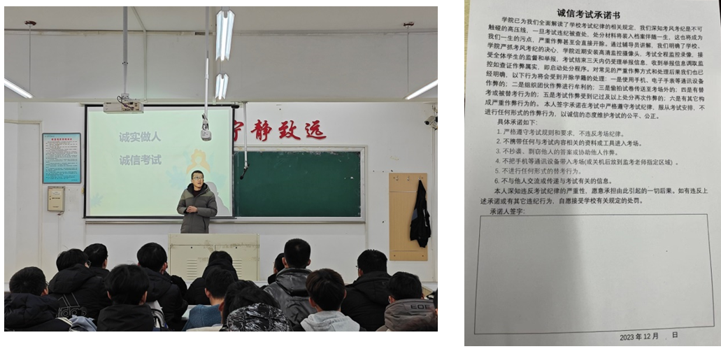 学院成立期末考试巡考领导小组。分别召开监考教师动员会与学生期末考试专题会,就期末考风考纪工作进行了部署。要求任课及监考教师应认真履责,严肃监考纪律;教育学生充分认识到端正考风、严肃考纪的重要性和必要性;辅导员召开主题班会,把抓考风促学风落到实处。同时学院通过抖音平台组织召开“家校携手,共育未来暨期末诚信考试教育”线上家长会,对大学生诚信考试及作弊被查处的后果等问题进行讲解,家校携手保证考风考纪。
