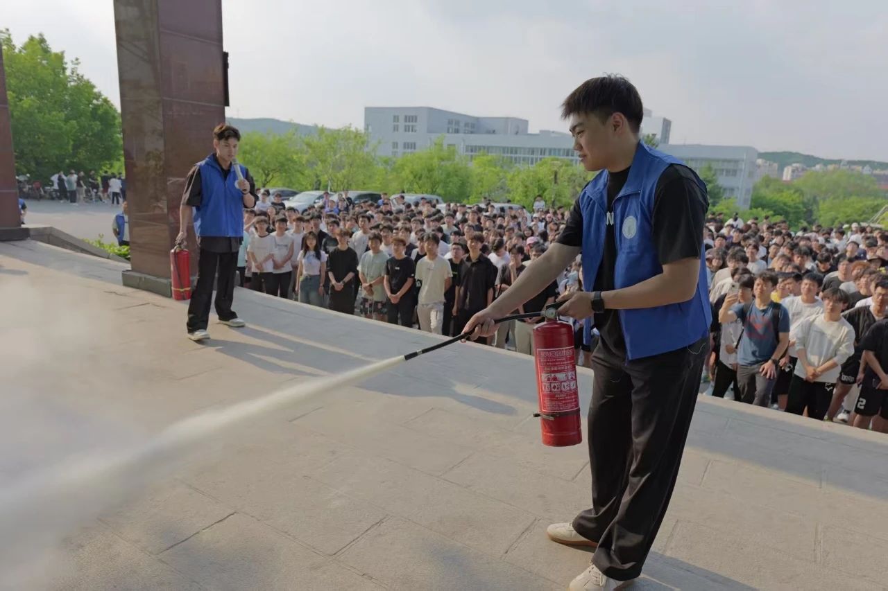在实操环节,学生骨干苏永祥化身“消防小导师”,现场讲解干粉灭火器、二氧化碳灭火器等常见灭火器的适用范围与性能特点,学生骨干任梁梓宾协助演示“提、拔、握、压”四字操作口诀,并指导同学们灭火演练,推动理论知识向实践能力转化。