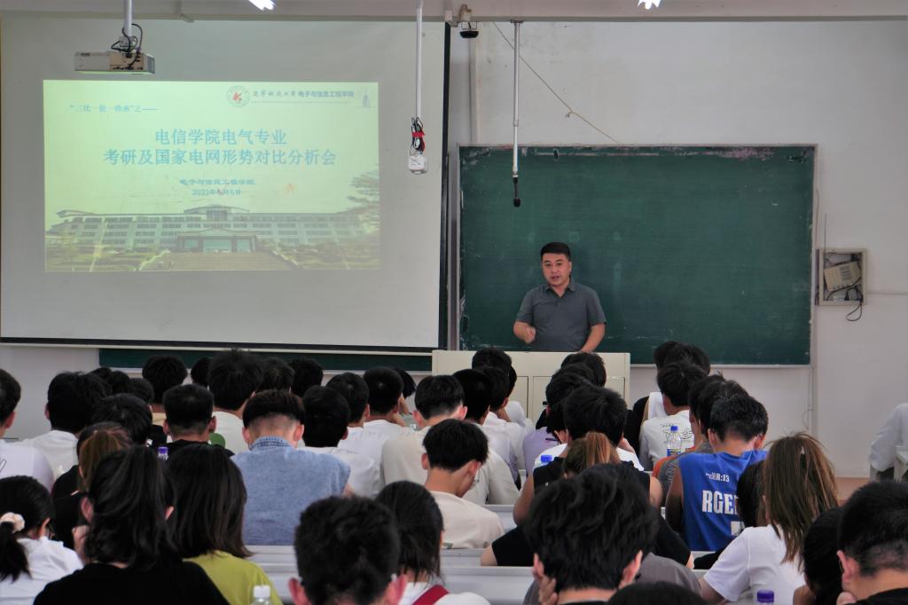 近年来,电信学院电气工程及其自动化专业的考研以及国网的通过率取得了阶段性成功,为激励学生对未来早规划,电信学院于6月6日召开电气专业考研及国家电网形势对比分析会。会议由电信学院党委副书记由济恺主持,全体22级电气专业学生参加会议。