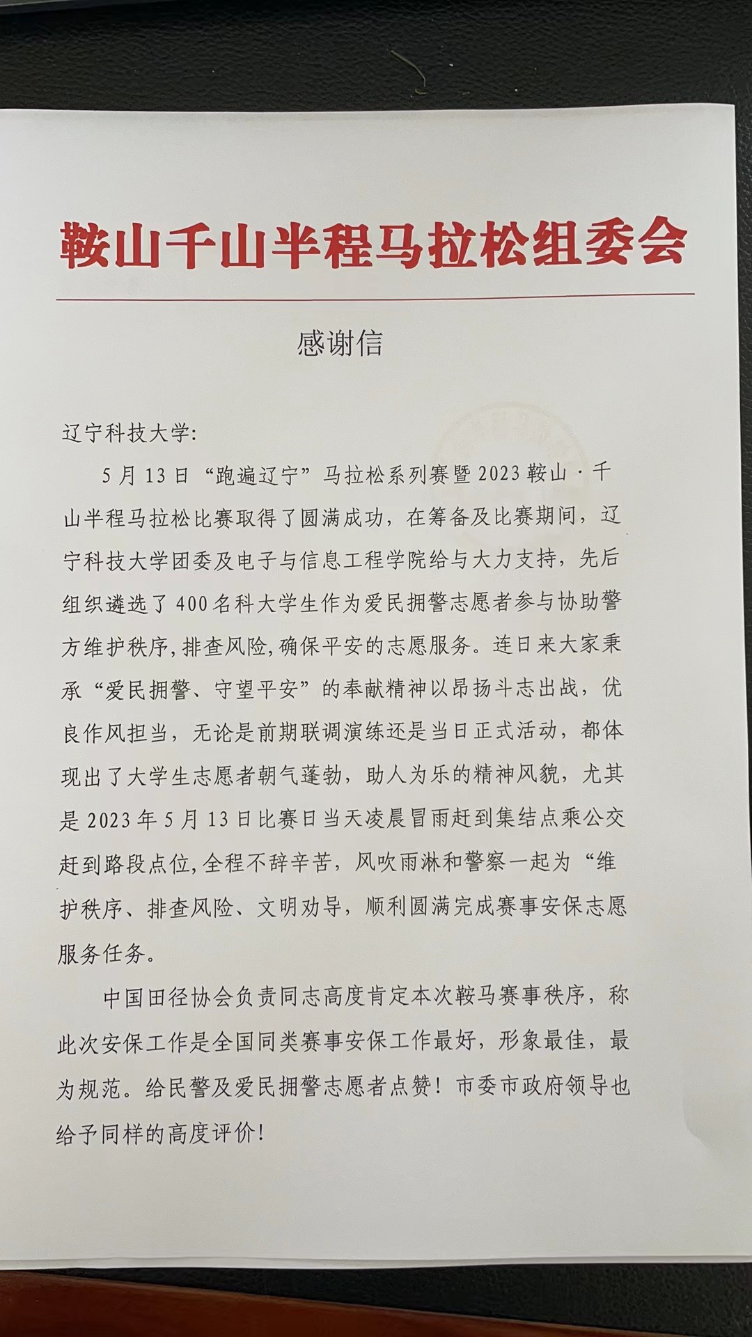 近日,乐动在线-乐动(中国)收到来自鞍山千山半程马拉松组委会的一封感谢信,由衷地感谢乐动在线-乐动(中国)团委及电子与信息工程学院给予“鞍马”赛事的大力支持,向辽科大400余名青年志愿者对此次马拉松做出的卓越贡献致以最真诚的谢意。