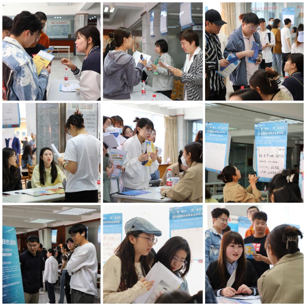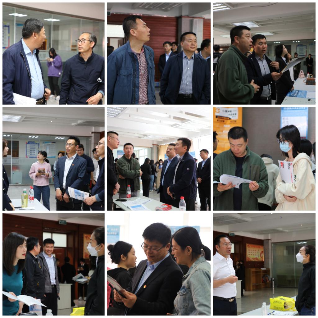 招聘会现场,毕业生拿着精心制作的简历寻找合适自己的岗位,学校学生就业处领导、学院领导、毕业班辅导员老师、专业课教师都在现场,为毕业生提供指导,了解企业用人需求。