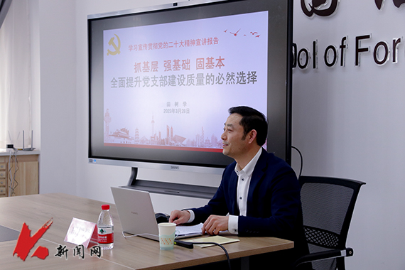 校党委常委、组织部部长田树学在博识楼A211,以《抓基层 强基础 固基本 全面提升党支部建设质量的必然选择》为题,为外国语学院、经济与法律学院师生代表作专题宣讲报告。田树学带领大家重温了《中国共产党普通高等学校基层组织工作条例》中关于党支部修订的内容,重点解读了《中国共产党支部工作条例(试行)》的部分内容,提出了在巡察工作中应该注意的几个方面,分享了他对于高校基层党支部高质量建设的一些思考。田树学说,治国安邦,重在基础;管党治党,重在基层。作为高校党务工作队伍的一员,肩负着为党育人、为国育才的光荣使命,一定要认真学习领会和坚决贯彻落实党的二十大精神,在基层党组织建设上下更大功夫,突出政治功能,着力提升组织力,推动基层党组织全面进步、全面过硬,让党旗在基层一线高高飘扬。