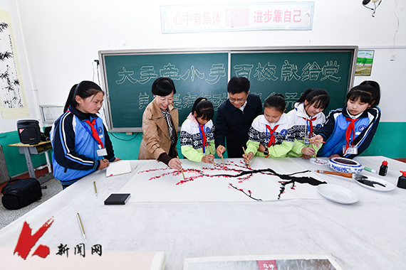 “风雨送春归,飞雪迎春到。已是悬崖百丈冰,犹有花枝俏。俏也不争春,只把春来报。待到山花烂漫时,她在丛中笑。”公开课在学生们的琅琅书声中拉开序幕,我校建艺学院教师王东将朗诵毛泽东诗词《卜算子·咏梅》作为切入点,带领中心学校的学生们共同品悟中国传统水墨画中蕴含的中国传统美学思想与人文精神,在教授梅花的画法与技巧的同时,将中华传统文化的意境之美、和谐之美、自然之美潜移默化地浸润到学生心中,使学生们能够学会享受绘画这门艺术的同时,达到修身养性、陶冶情操的效用。作画环节,校领导也纷纷拿起笔与学生们共同创作这幅百梅图,在和谐、融洽的气氛中结束了这堂生动的公开课。