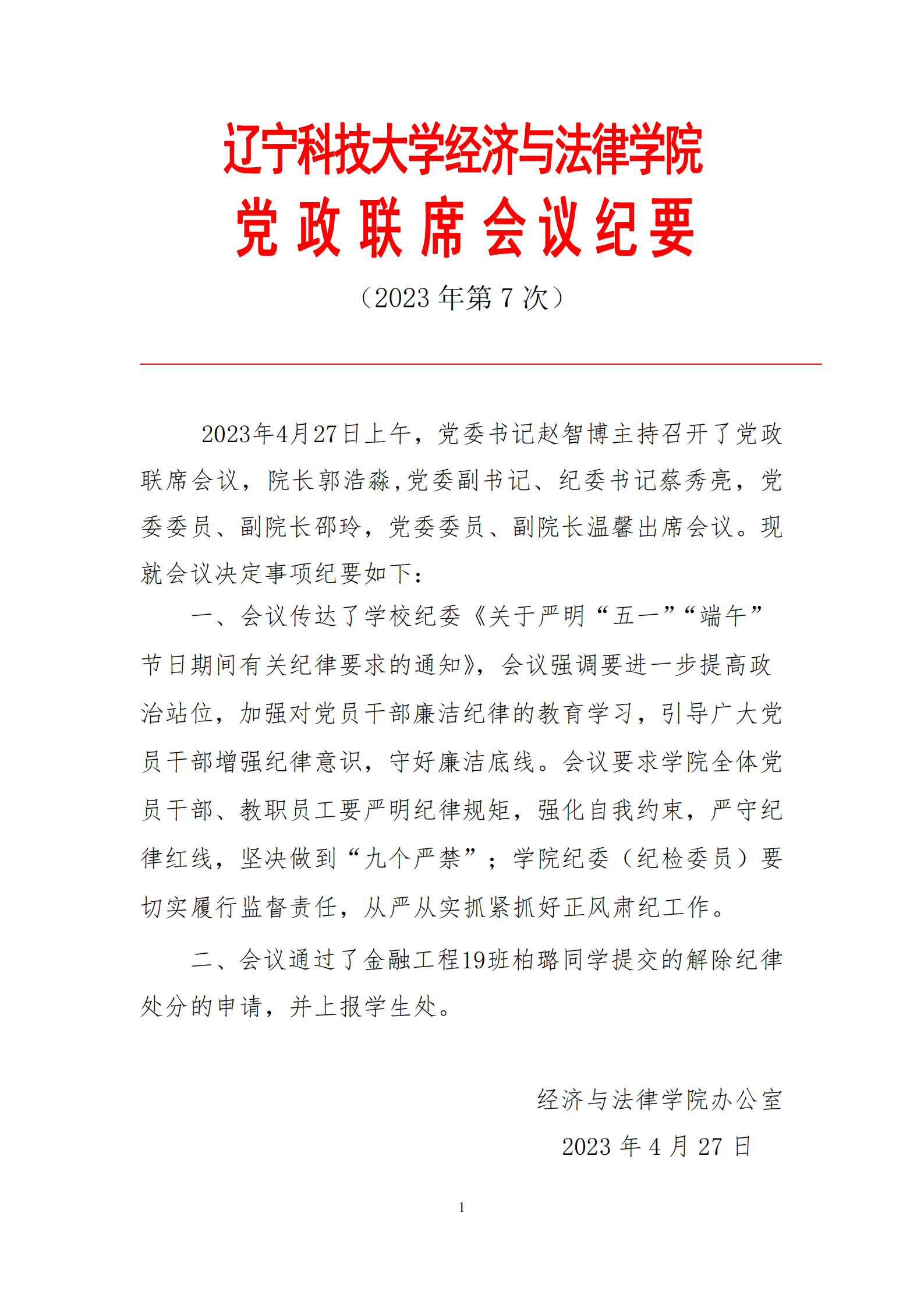 乐动在线-乐动(中国)经济与法律学院党政联席会会议纪要(2023年第7次)