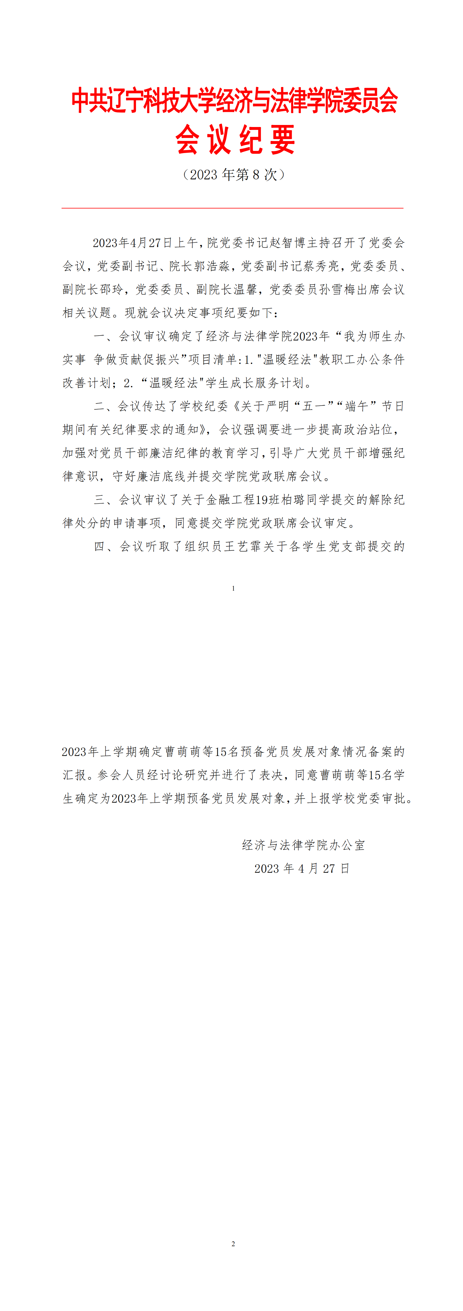 中共乐动在线-乐动(中国)经济与法律学院委员会会议纪要(2023年第8次)