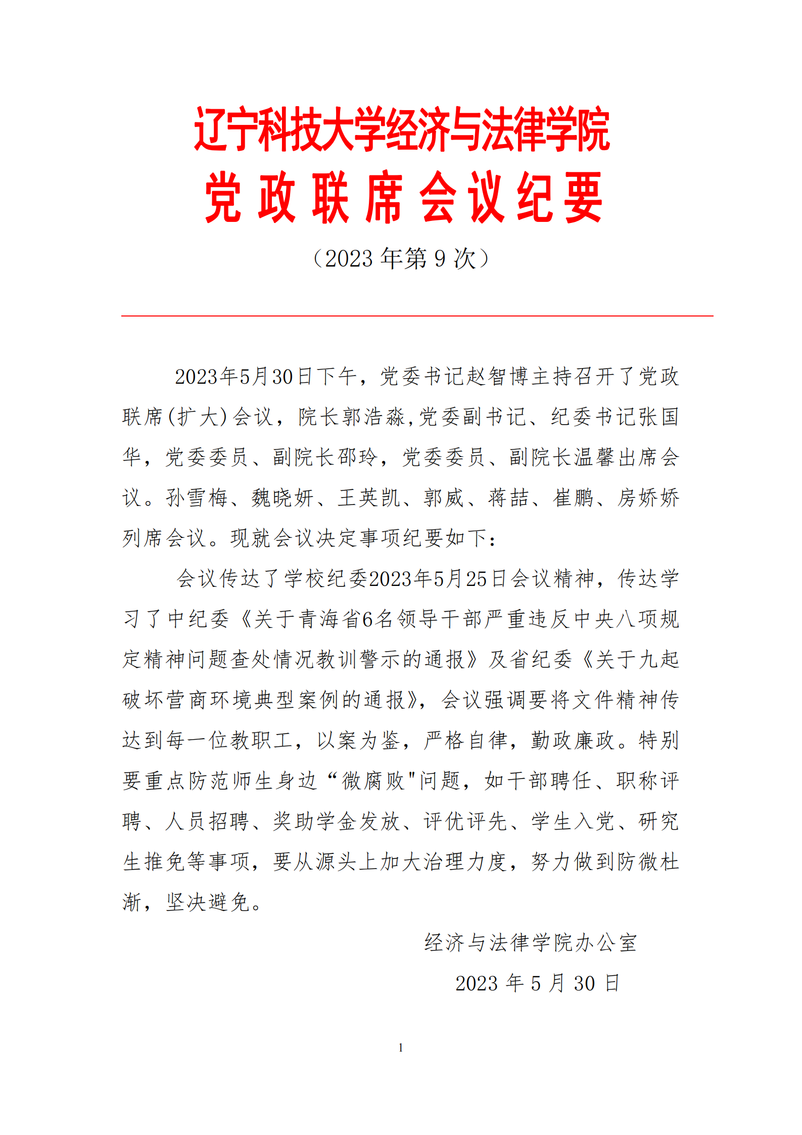乐动在线-乐动(中国)经济与法律学院党政联席会议纪要(2023年第9次)