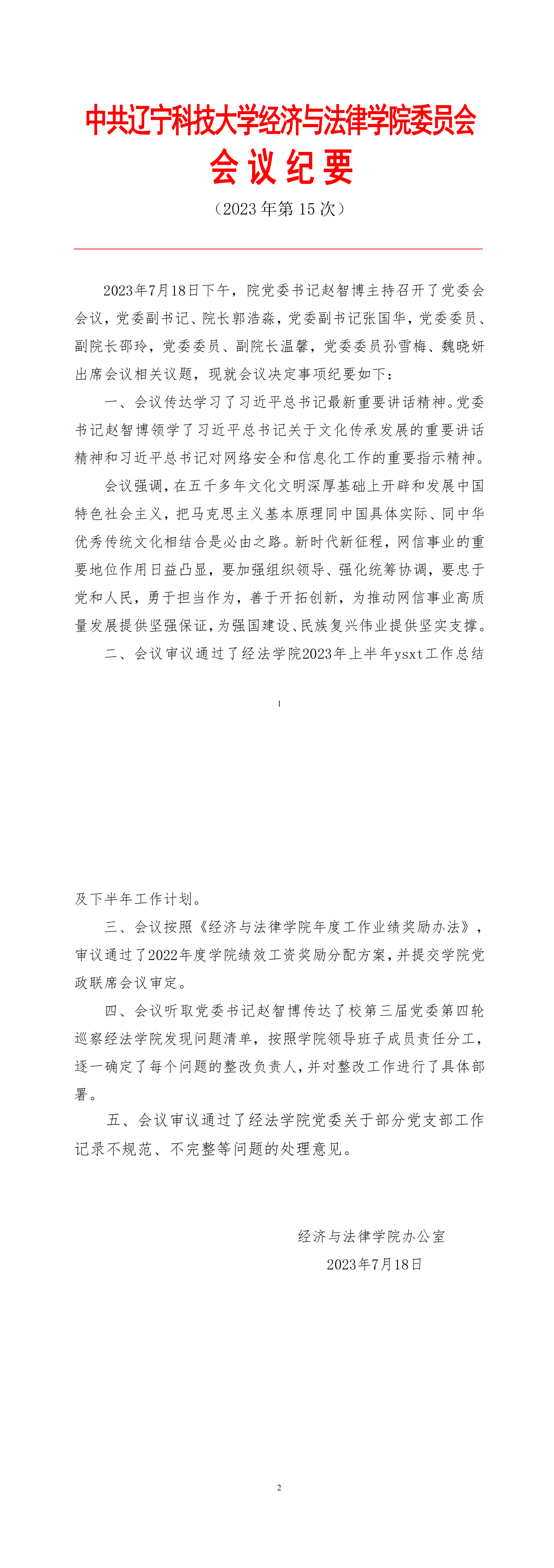中共乐动在线-乐动(中国)经济与法律学院委员会会议纪要(2023年第15次)
