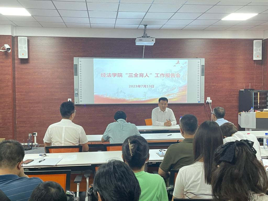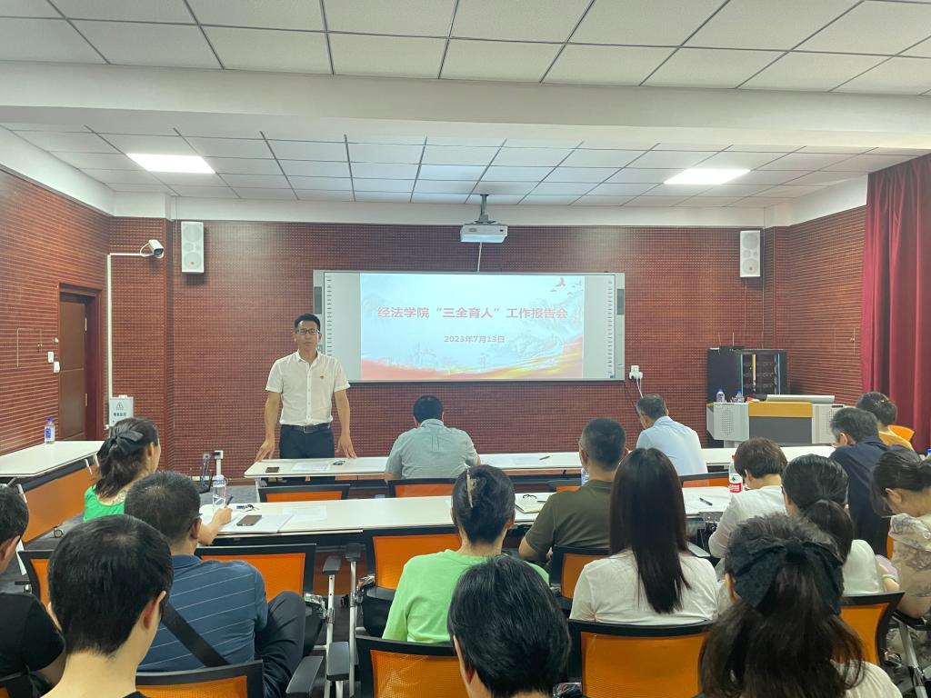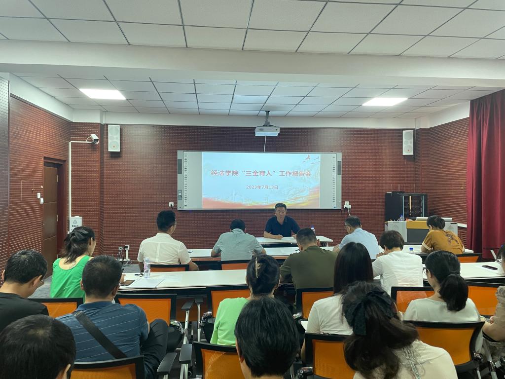 7月13日上午,经济与法律学院在博识楼A407会议室召开了"三全育人"报告会。会议由学院党委书记赵智博主持,法律系主任蒋喆,国贸系主任王英凯和学院团委副书记张鹏飞3名教师作经验交流报告,全院教职工出席了会议。