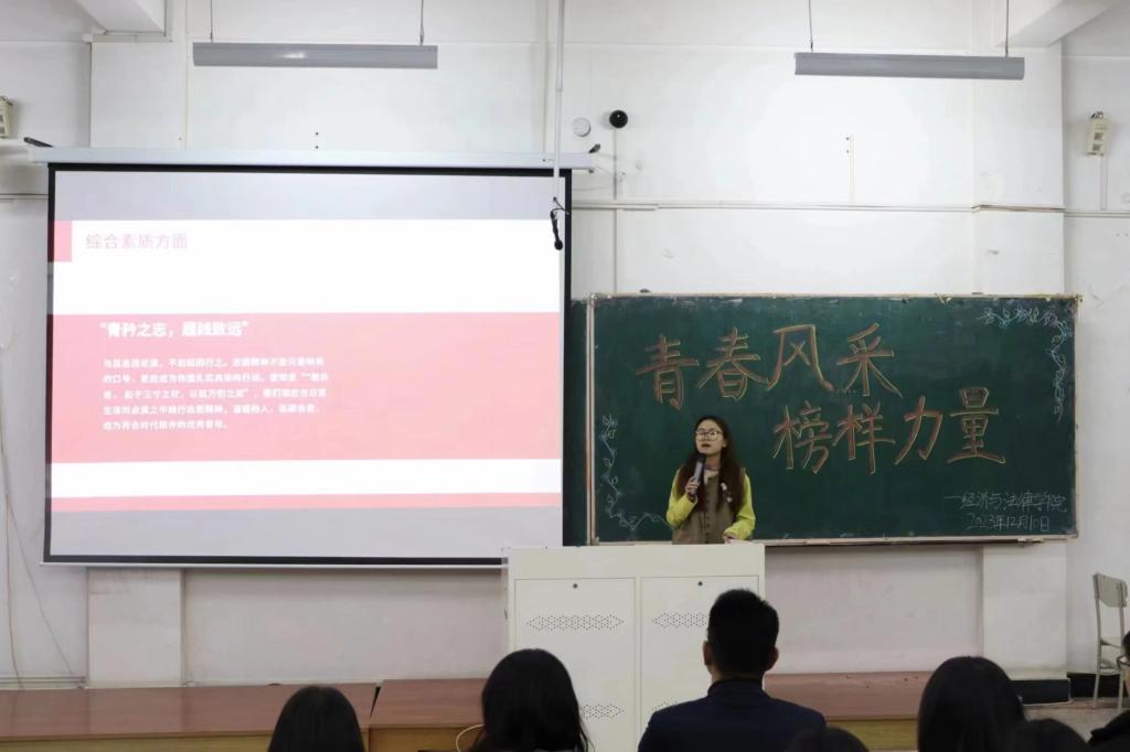 12月10日,经法学院于博学楼C102开展“青春风采 榜样力量”主题宣讲会。学院优秀学生代表2023年钢铁标兵年度人物代郁璇、十佳大学生张诗晗琪、道德楷模刘豪、十大学习标兵于澜受邀担任宣讲人,经法学院党委书记赵智博以及团学骨干出席会议,学院2022级、2023级350名本科生参加会议。