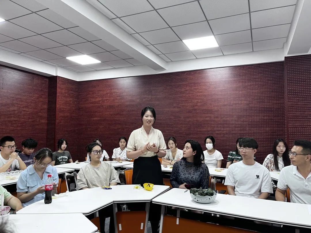 金融科技21-2班张茗以一段视频向大家讲述了端午节的来历和习俗,并指出同学们应该通过端午节进一步了解中华优秀传统文化,坚定文化自信、涵养家国情怀。2019级的优秀毕业生代表们为学弟学妹们送出寄语与美好祝福,希望大家能够珍惜美好的大学时光,把握每一次突破自己的机会,留下美好青春中的点滴回忆。藏族同学法学22-2班次仁玉珍为大家演唱了藏族歌曲,大家品尝着学院准备的香甜可口的粽子和水果零食,相互交流体会和感悟,在欢声笑语中畅谈学习、工作与未来。