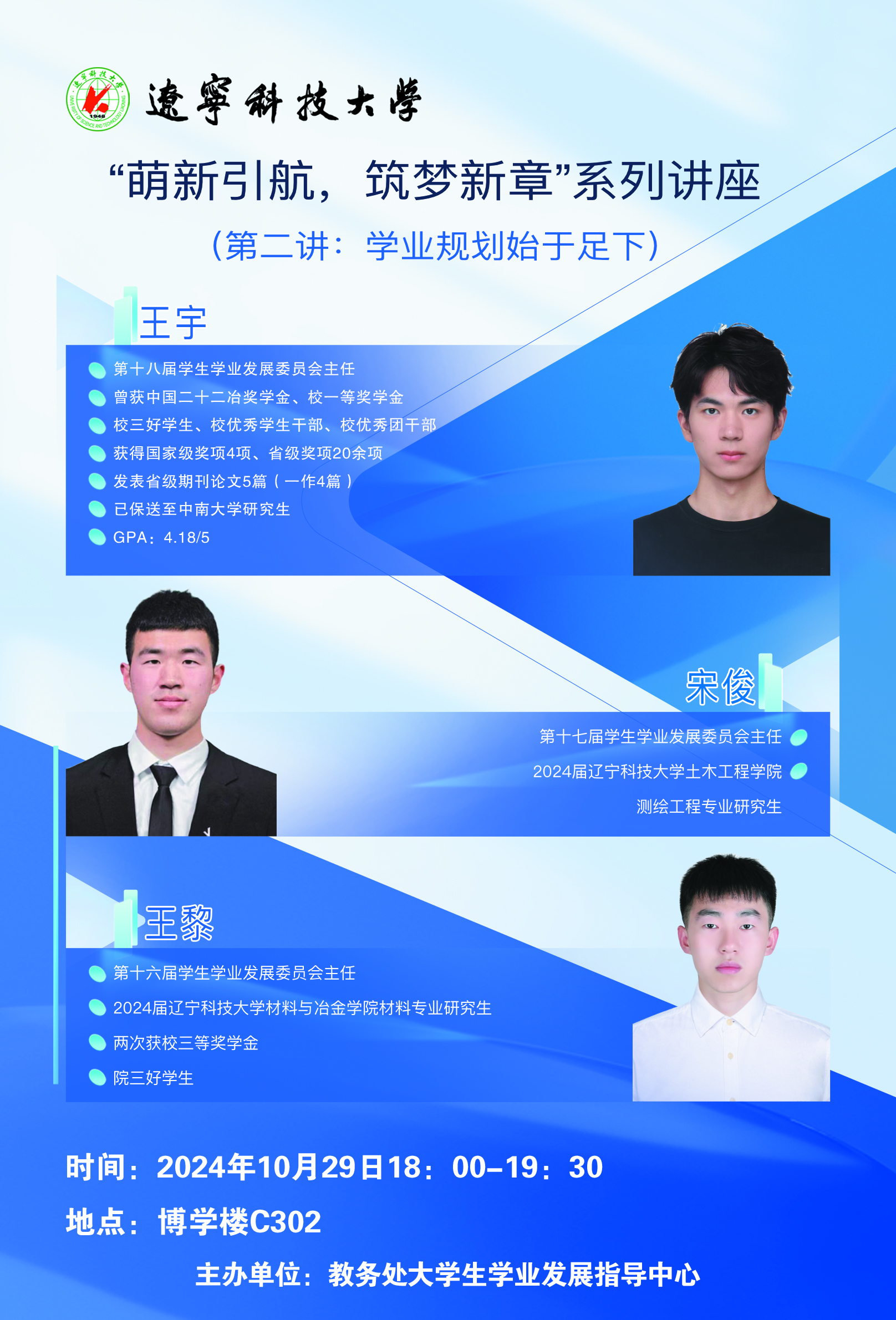 10月29日,教务处大学生学业发展指导中心面向2024级新生举办的“萌新引航,筑梦新章”系列讲座第二讲《学业规划始于足下》在博学楼C302教室开讲。辽科大学生学业发展委员会历届主任王宇、宋俊、王黎为学校300余名新生作讲座。