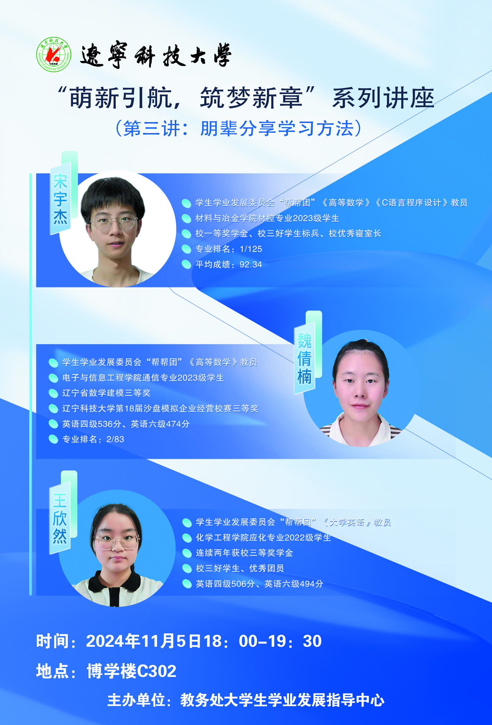 11月5日,教务处大学生学业发展指导中心面向2024级新生举办的“萌新引航,筑梦新章”系列讲座第三讲在博学楼C302教室开讲。辽科大学生学业发展委员会“帮帮团”教员魏倩楠、王欣然、宋宇杰为学校300余名新生作《朋辈分享学习方法》专题讲座。