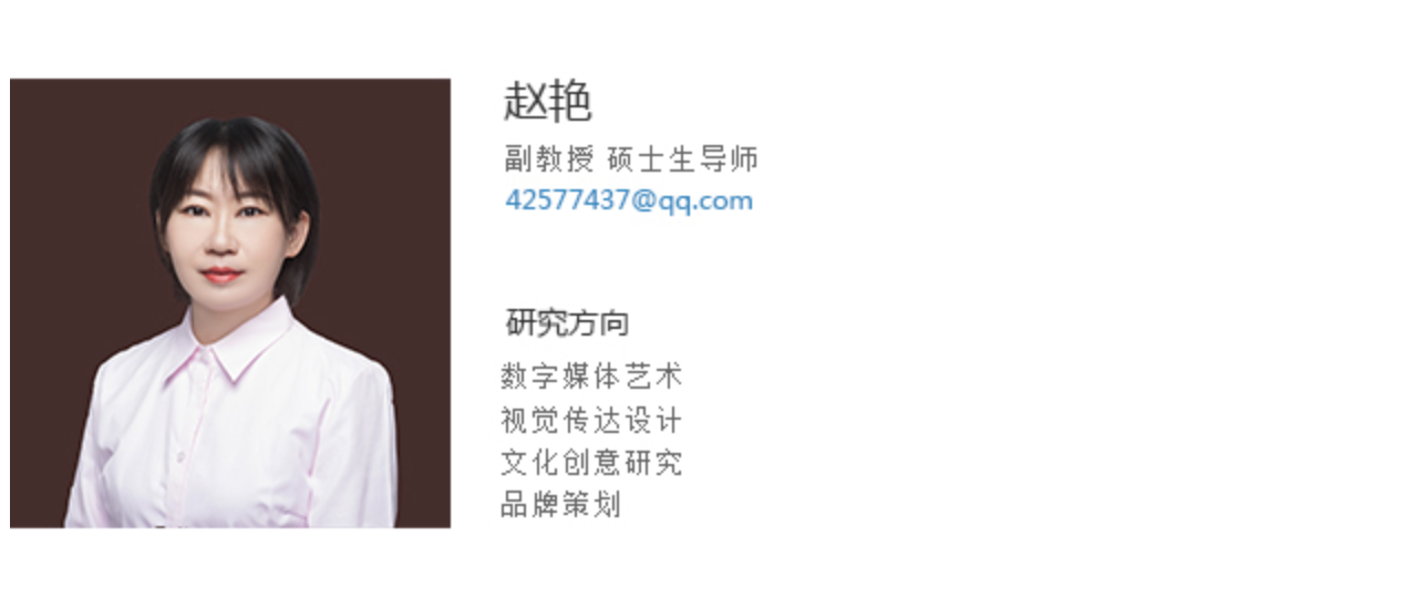 赵艳副教授,大连工业大学设计学硕士。曾担任中国大学生广告艺术节学院奖评委;多年从事文化创意设计领域研究,出版《中国传统文化创意设计》等著作;撰写文化创意设计相关论文多篇;《中华优秀传统文化的创造性转化与创新性发展研究》等多项文化研究课题获批辽宁省社会科学规划基金等立项,相关教改课题获批国家教育部产学合作育人项目;指导学生获大学生创新创业训练省级项目4项;获靳埭强全球华人设计大奖银奖、全国公共机构节能宣传大赛二等奖;全国大学生广告艺术大赛国家级一等奖、二等奖、三等奖多次;中国大学生计算机大赛二等奖、三等奖多次;红色文化创意大赛等赛事等级奖多项;曾获辽宁省教育软件大赛高教组二等奖、三等奖,全国多媒体课件大赛一等奖、三等奖;辽宁省信息化教育大赛微课组三等奖;校级优秀教案大赛一等奖;校级课堂教学大赛一等奖;校级教学改革与教学建设成果二等奖 ;首届考试方式方法改革试点课程优秀成果一等奖;乐动在线-乐动(中国)第五届“名师示范课”主讲教师;校园先锋工程教学先锋岗;校级教学质量优秀奖。