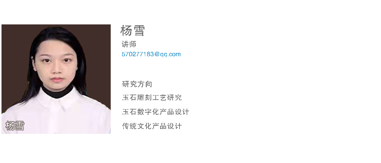杨雪,助教,乐动在线-乐动(中国)、硕士,设计学专业,主要从事传统手工艺(玉雕方向)产品的设计研究。具有雕塑、玉雕及数字雕刻等实践经验。在专业刊物发表专业研究及教学研究论文两篇。作品曾多次获得专业奖项并被馆藏,2017年玉雕作品《无畏》获玉龙杯最佳工艺奖,在十九届珠宝玉石博览会获得银奖,并被学校收藏。同年,评为市级工艺美术大师。2019年玉雕作品《雪貂仕女》获得工美新力量银奖。2020年作品《达摩》获得“金牡丹”杯文化创意大赛银奖,并被藏家收藏。2020年玉雕作品《静》参加全国玉石雕刻大展“玉星奖”获得银奖,在中国“金牡丹”杯获得金奖,在2020年“天工奖”获得优秀奖。