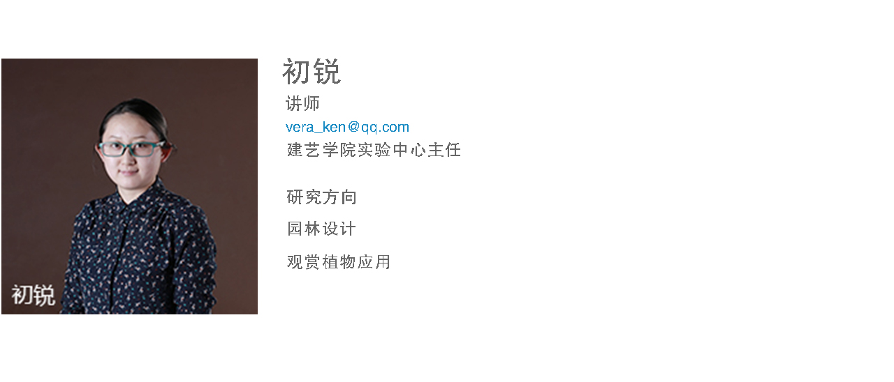 初锐讲师,硕士,东北林业大学园林专业学士、园林植物与观赏园艺专业硕士毕业。2013年8月从教于乐动在线-乐动(中国)建筑与艺术设计学院环境设计专业,主讲《景观设计原理》、《园林植物学》、《景观设计》等课程。荣获2015年辽宁省教育软件大赛高等教育组优秀奖。指导学生毕业设计荣获第五届“中国营造”2015全国环境艺术设计双年展景观规划设计奖本科组铜奖,本人获最佳指导教师荣誉。指导省级大学生创新创业项目一项,校级两项。