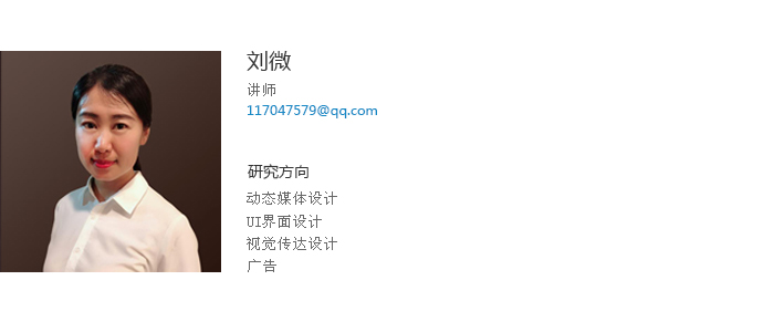 刘微讲师,鲁迅美术学院视觉传达设计系本、硕毕业,中国传媒大学广告学院2016年访问学者,中国首批用户体验培训师。乐动在线-乐动(中国)建筑与艺术设计学院,讲师,“艺术设计创新创业实践班”负责人。乐动在线-乐动(中国)2014年校优秀毕业设计指导教师,2015年度校教学质量优秀奖,2016年度校优秀教师。在《教育与职业》、《艺术教育》等期刊发表教育研究论文多篇,指导学生发表论文数篇。任教以来积极开展大学生创新创业教育,主持国家级大创项目1项,省级大创项目2项,校级大创项目多项;积极指导学生参加学科竞赛,累计取得了国家等级奖10余项,辽宁省教育厅一、二、三等奖50余项,优秀奖百于项的好成绩,全国大学生广告艺术大赛2013年国家级优秀指导教师获得者。出版大学生创新创业教材一部,《动态构成实训教程》,编著。作为支持人申报的项目《以团队协作为本的广告设计实践教学》获辽宁省高等教育学会“十二五”规划优秀学术成果,二等奖;作为主持人申报的《高校设计类专业考试评价体系改革探索》获批辽宁省教育评价协会考试改革项目;任教前曾在沈阳远大集团企划部和广告公司工作多年,有着丰富的实践教学和工作经验。