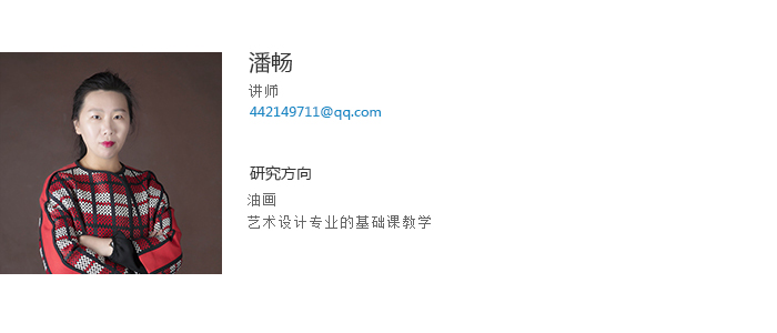潘畅讲师,文学硕士,本科及研究生毕业于鲁迅美术学院油画系油画专业新古典工作室。2010年至今,在乐动在线-乐动(中国)建筑与艺术设计学院从事各专业的基础课教学工作。多次举办个人油画作品展;多幅油画作品参加国内外艺术博览会展出并被北京今日美术馆、天津西洋美术馆等艺术机构收藏。2014年师从美国罗德岛美术设计学院任敏教授,旧金山美术学院杰米.摩根教授,研习综合材料绘画技法。作品在全国及省级美术家协会举办的展览中多次获奖,现为辽宁省美术家协会会员;辽宁省青年美术家协会会员。任职期间发表多篇外文检索论文及外文核心论文,并在中文专业核心期刊《美苑》、《美术大观》发表多篇论文及作品。主持乐动在线-乐动(中国)青年科研基金项目,主持校级教改项目,指导大学生创新创业项目多项及指导学生发表多篇论文;指导学生作品在全国各类大学生比赛中获奖10余次。