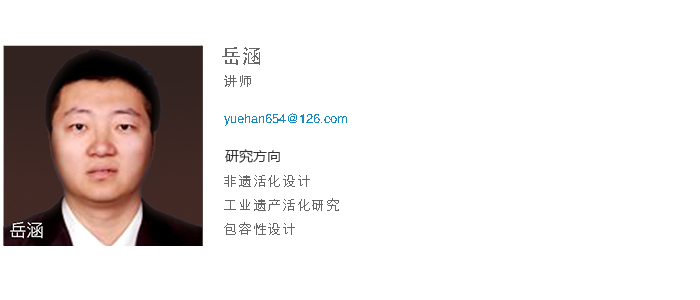 岳涵, 发表论文40余篇,主持教育部产学研项目、辽宁省教育厅项目、辽宁省社科联项目等7项。中国农机学会高级会员,中国农机学会工业设计分会委员,全国三维数字化创新设计大赛评审专家,中国好创意辽宁分赛区委员、辽宁省应急救援创新设计大赛评审专家、辽宁省智能制造科普创意创新大赛评审专家。2018年获辽宁省普通高等教育本科教学成果一等奖。2015、2017、2021、2023年获辽宁省大学生工业设计大赛优秀指导教师,2018年获辽宁省大学生机械设计大赛优秀指导教师。