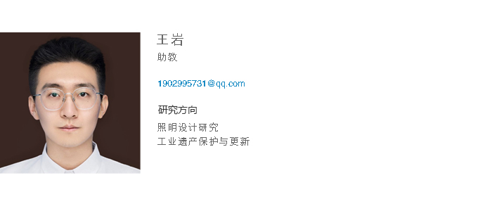 王岩,助教, 2021年毕业于乐动在线-乐动(中国),艺术学硕士学位。曾在大型照明设计院任职,参与多个国内景观照明工程与数字媒体照明工程并荣获多个奖项,具有相关工作经验。