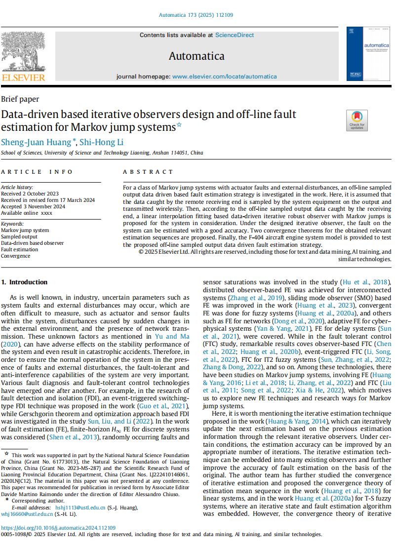 辽科大“数学方法与智能控制理论”团队首次在该顶级期刊发表学术成果“Data-driven based iterative observers design and off-line fault estimation for Markov jump systems,Automatica,2025,173:112109”。该学术成果是由科研团队负责人黄胜绢(S.-J.Huang)教授及其指导的研究生李世鸿(S.-H.Li)合作完成。该学术成果主要针对一类具有马尔可夫跳变的控制系统,通过系统的离散采样输出数据,结合线性插值拟合方法构建了一种基于数据驱动的迭代观测器,实现了对系统的状态和故障的准确估计,从而完成对系统的远程故障诊断。同时,该学术成果提出了一种积分序列收敛性理论,确保逼近残差在一定条件下是收敛的,突破了传统故障估计方法只能确保逼近残差范数有界的局限,在确保系统安全性和可靠性方面有着重要的理论和应用价值。