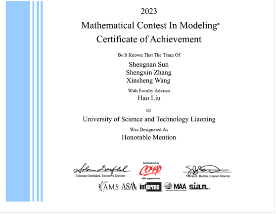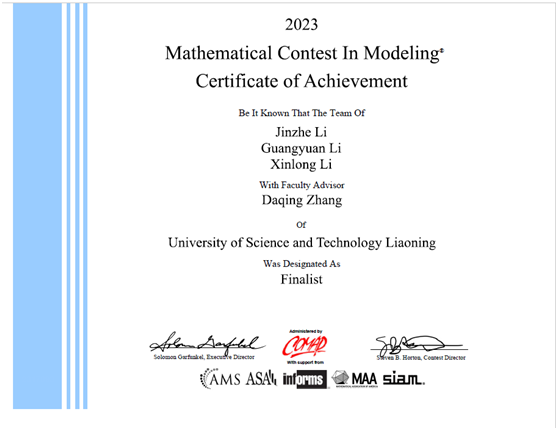 此次比赛,共有来自中国、美国、澳大利亚、加拿大、英国和其他国家及地区顶尖高校的近三万支队伍参加。在教务处、理学院、创新创业学院的精心组织下,共有来自全校不同学院的近百名学生组成了28支代表队参赛。在四天时间内,在学校、指导老师及各参赛同学的共同努力下,就指定的问题完成从建立模型、求解、验证到论文撰写的全部工作。我校张大庆老师指导的队伍荣获特等奖提名奖1 项,特等奖提名奖(F奖)获奖比例仅约为2.63%。另外,我校学生还获得二等奖3项,三等奖23项。
