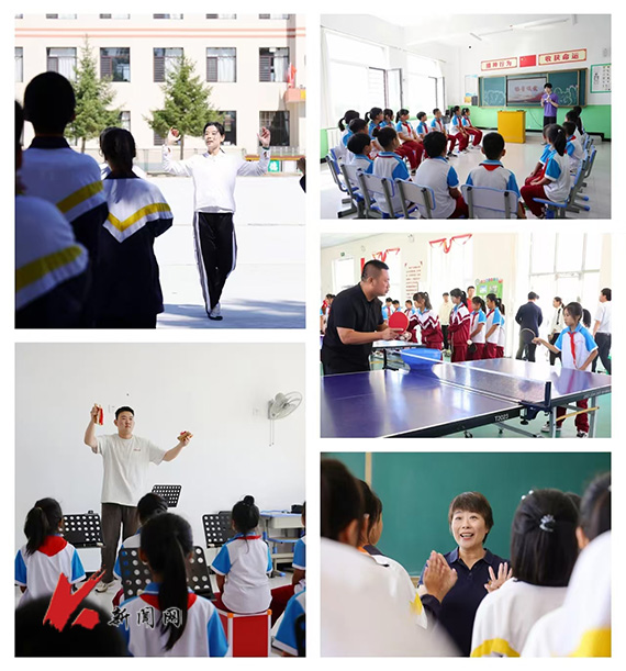 仪式后,辽科大随行的教师团队为桑林镇中心学校的学生们带来了一场别开生面的“浸润体验”。艺术学院院长李囝、体育部副主任曲博等教师和参加活动的辽科大学生,分别带领桑林镇中心学校中学部、小学部5个班级,以及社团100余名学生代表进行了“体育美育浸润”主题教学示范公开课与活动指导,通过乒乓球、啦啦操、声乐、播音、曲艺等体育和艺术形式,将爱国主义教育、团队协作与创新能力培养融入体育运动和美育活动中,帮助学生们在竞技、表演的同时收获成长和快乐。一时间,操场上、课堂中欢声笑语,学生们积极参与,努力为团队增光添彩,每一次“活动展示”都得到了现场师生的热烈掌声。