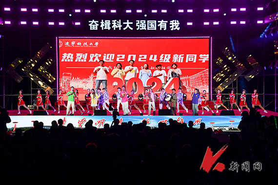 文艺晚会主题为“奋楫科大·强国有我”,分为“炫舞青春”和“燃梦未来”两个篇章。在激动人心的倒计时和炫彩灯光秀后,研究生、留学生、藏族学生代表和校彩虹啦啦操队一同登台,伴随着悦动的旋律,歌舞《让我们一起出发》尽显辽科大学子的青春活力风采;曲艺说唱《这一方热土》,唱出了鞍山的厚重历史、地域文化和钢铁特色,描绘出了辽科大人接续奋斗、为国奉献钢筋铁骨的生动画卷;由博士教师组合演唱的歌曲《天地龙鳞》雄浑豪迈、大气磅礴,唱出了中华民族自强不屈的精神血脉,更唱出了新时代中华儿女奋力推进强国建设、民族复兴伟业的坚强意志和美好愿望;创意表演《沧海一声笑》,融合戏曲、武术、说唱元素,让人耳目一新;由经法学院新生刘舒扬及家长演唱的歌曲《花开忘忧》唱出了母爱的无私伟大,也用歌声代表2024级新生为身在远方的父母送去了惦念和祝愿;街舞《青春未来式》节奏动感、张力十足;国风歌舞《昨夜小楼又东风》如诗如画,尽显国风之美;由筑梦合唱团和军训教官表演的《强国有我》激情澎湃,青春热血;相声《大风车》带领2024级新生秒回童年,现场笑声掌声此起彼伏。