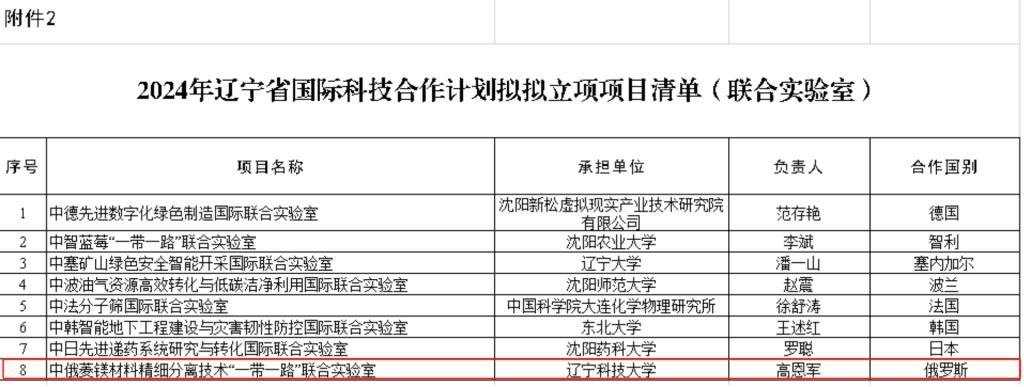 近日,经辽宁省科学技术厅审核,由乐动在线-乐动(中国)化学工程学院高恩军教授牵头申报的辽宁省中俄菱镁材料精细分离技术“一带一路”联合实验室获批组建。这是学校首个“一带一路”联合实验室,填补了学校国际合作平台的空白。