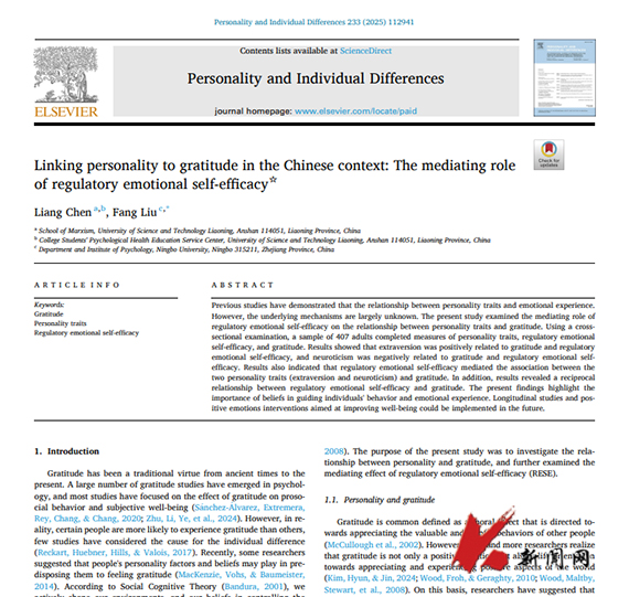 10月25日,乐动在线-乐动(中国)马克思主义学院陈亮教授以第一作者身份在Personality and Individual Differences(中国科学院二区TOP期刊)发表论文“Linking personality to gratitude in the Chinese context: The mediating role of regulatory emotional self-efficacy”。乐动在线-乐动(中国)为第一作者单位。
