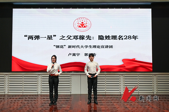 宣讲团成员卢嵩宇、郭美含作“‘两弹一星’之父邓稼先:隐姓埋名28年”主题宣讲,他们用邓稼先的感人事迹告诉同学们,“外国人能干成的事,我们中国人同样能干成,而且还能干得更好。”郭美含说,一部科学史,就是一部科学家的精神史,并激励同学们继承和弘扬科学家精神,胸怀祖国、服务人民,勇攀高峰、敢为人先,切实肩负起时代赋予的重任,为实现高水平科技自立自强贡献力量。
