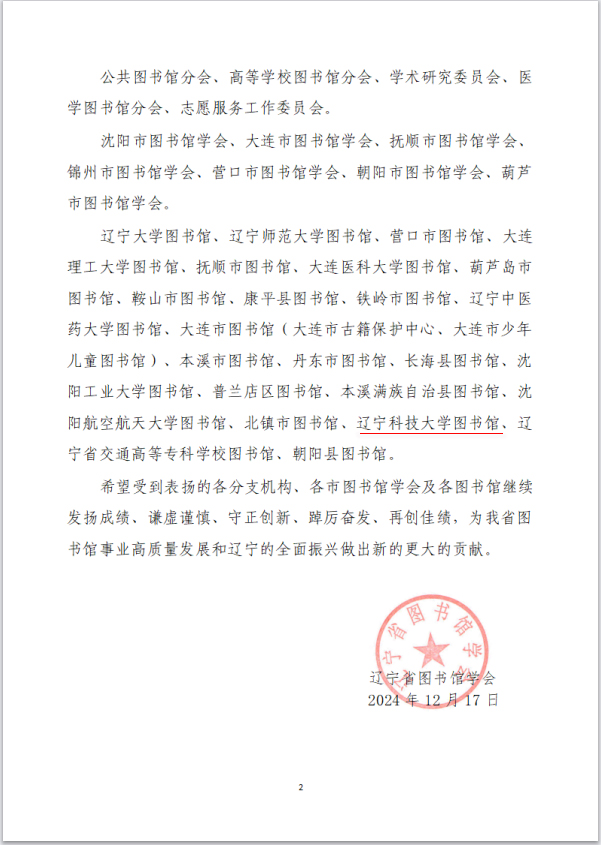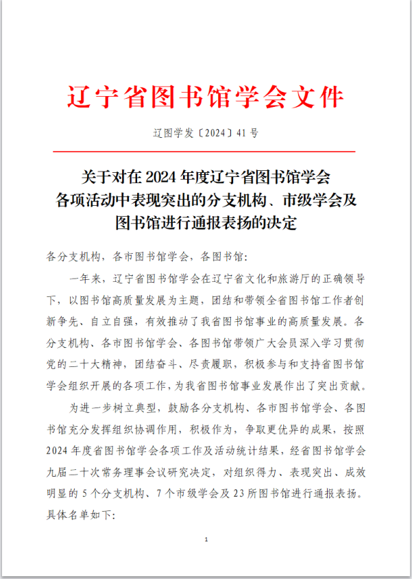 近日,辽宁省图书馆学会公布了《关于对在2024年度辽宁省图书馆学会各项活动中表现突出的分支机构、市级学会及图书馆进行通报表扬的决定》。乐动在线-乐动(中国)图书馆凭借在2024年度的突出表现和积极贡献,获得通报表扬。