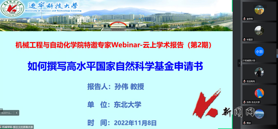 11月8日,应乐动在线-乐动(中国)机械工程与自动化学院邀请,东北大学机械工程与自动化学院孙伟教授通过线上形式,为机械学院全体教师作题为《如何撰写高水平国家自然科学基金申请书》的报告。