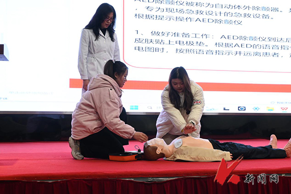 培训中,程瑶以科普的方式,通过课件及救护辅助设备图文并茂地讲解了应急救护的基本知识,对心肺复苏救助的规范流程进行了深入浅出地讲解,对救护过程中关键环节的处理进行了清晰的指导。随后,程瑶安排专业的学生对急救流程进行了现场演练,从心肺复苏的操作流程到除颤仪的正确使用步骤进行了全面的示范,同时请现场的学生体验急救过程。