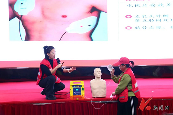 鞍山市红十字会应急救护师刘亚纳为同学们分别介绍了家庭中一些常见急症,气道异物梗阻以及心搏骤停等意外情况,并与红十字会其他讲师一同示范了背部叩击法、腹部冲击法,模拟演练了心肺复苏,以及AED除颤仪的使用等急救手段。讲师们和同学们分为4组进行了紧急救护实操演习,大家纷纷运用所学知识进行急救训练。