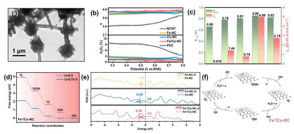 图1. Fe/Co-NC催化剂的微观形貌、ORR性能和机理图