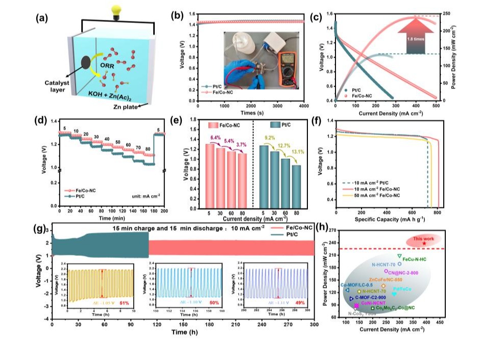 迟缓的氧催化反应动力学过程直接限制了锌-空气电池(ZABs)的能量转换效率,构建促进氧还原反应(ORR)的高效催化剂可满足高性能ZABs的迫切需求。然而通过优化ORR中氧中间体的吸附和解吸行为来提升催化剂的催化能力更具挑战性。近期,研究人员将多层次活性位点封装在1D/3D杂化导电网络骨架中,构建了具有串珠状结构的多层次铁、钴双金属催化剂(Fe/Co-NC)。通过构筑的多层次催化活性位点来改变活性位点的配位环境进而优化了ORR中氧中间体的吸附和解吸过程,提升氧还原动力学。研究发现,在较高的极限电位下,多层次活性位点加速了ORR的决定步骤、削弱了氧中间体的吸附和解吸,有利于4电子转移过程(图1)。得益于独特的多层次催化活性位点以及串珠状1D/3D混合导电网络结构,Fe/Co-NC作为电池阴极催化剂组装的ZABs可提供超高的功率密度(238.6 mW cm