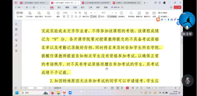 2024年6月24日晚,学院召开2023-2024学年第二学期期末考试工作线上会议,会议由教学副院长张玉军主持,学院领导班子成员及专任教师、综办及学办相关工作人员参会。
