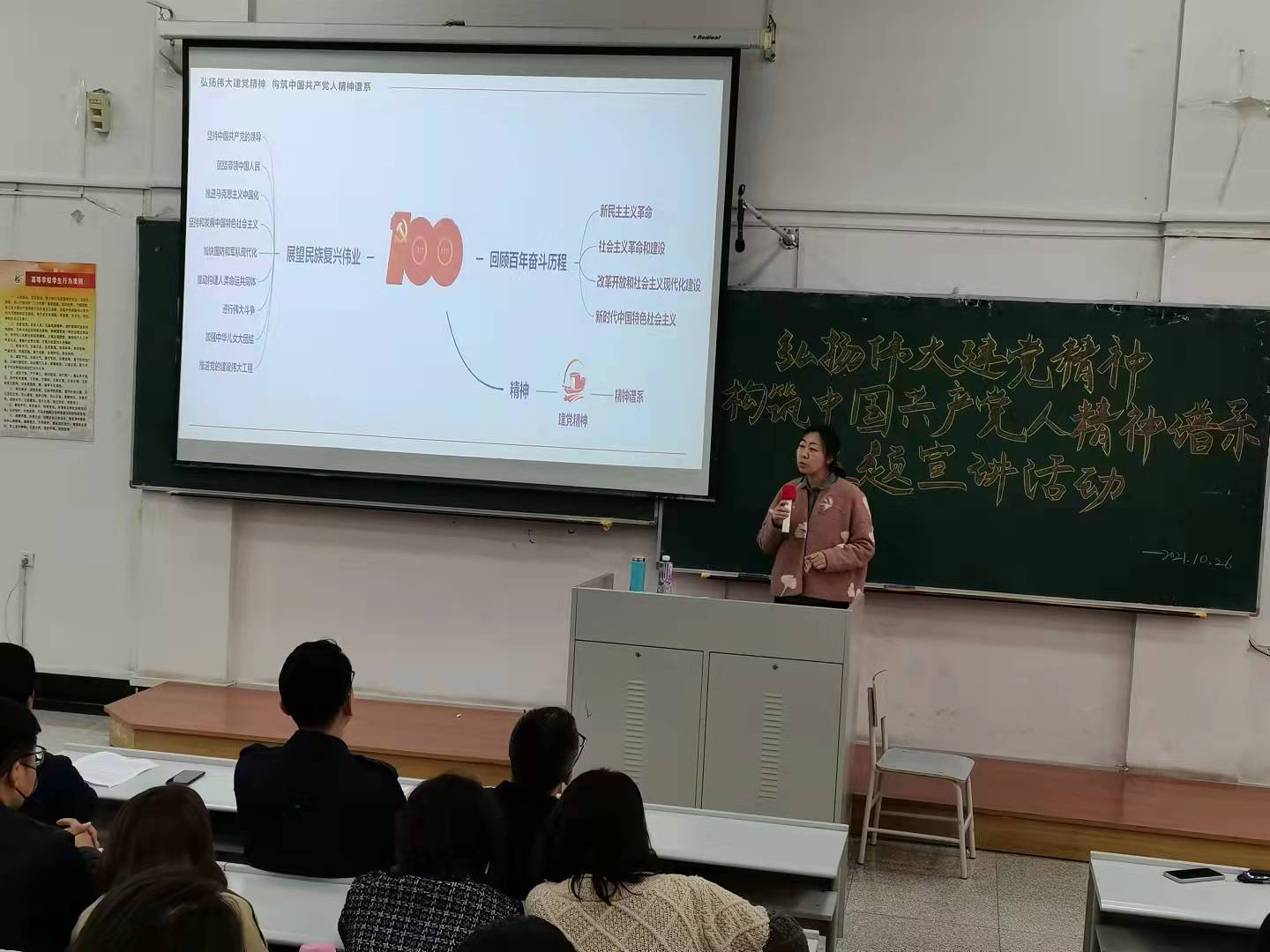 随后,马克思主义学院老师王书菲宣讲题目是《弘扬伟大建党精神 构筑中国共产党人精神谱系》,她带领全场师生回顾了中国共产党百年奋斗历程中构筑的中国精神谱系,接着,她又将“红船精神”与鞍山地区第一个党支部的建立、“井冈山精神”与鞍山地区红色摇篮的创立、“抗战精神”与 辽南地区的抗日斗争相结合,向在场师生介绍了党的伟大精神对鞍山地区党的发展的影响,也娓娓道来了新时代的辽宁精神,让在场听众深入理解了党的精神谱系对我们脚下这片土地的深刻影响。