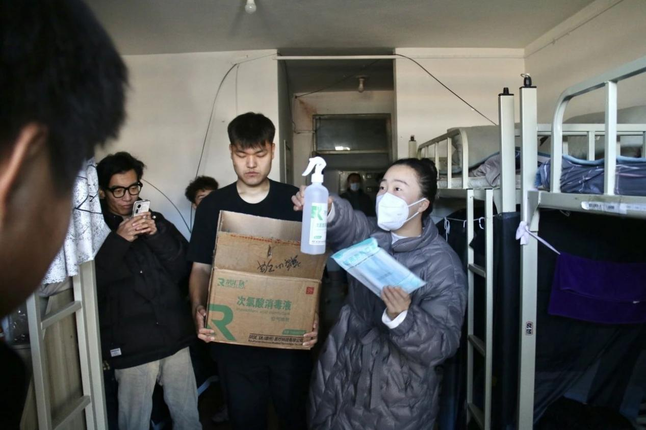 冬季气温多变,正值各种传染病特别是呼吸道传染病的高发季节,学院教师仔细检查了学生寝室通风、卫生、内务整理等方面情况,走访生病寝室,认真叮嘱同学们要注意好寝室卫生、保持通风、按时对寝室进行消杀,尽量不去人群密集、空气不流通的封闭场所,如出现身体不适等情况及时就医治疗。随后,学院教师为同学们足额足量发放口罩和消毒喷剂,并提醒同学们消毒喷剂的用量要求。