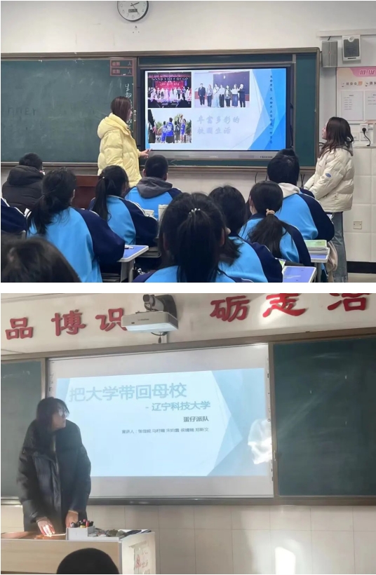 1月17日至22日,由侯婧楠、宋昀霏、张佳妮、马籽暄、郑斯文五位同学组成的“蛋仔派队”在鞍山市第五中学、沈阳市共青团实验中学、鞍山市育英中学等学校开展了“把我的大学带回母校”社会实践活动。他们向学弟学妹们讲述自己在辽科大的故事,让他们更加深入了解了真正的大学生,大学生活是什么样,使他们对大学有了更多的憧憬与遐想。在辽科大,她们不仅收获了丰富的知识和技能,更收获了交心的朋友和难忘的回忆。这次的活动让她们有机会把这些宝贵的财富带回母校,与学弟学妹们分享。并通过发放调查问卷的形式收集学弟学妹们的升学意向、未来规划以及对大学生活的期待。作为新一代大学生,肩负着时代责任,更应牢记初心,不忘使命,让青春在全面建设社会主义现代化国家的火热实践中绽放绚丽之花。
