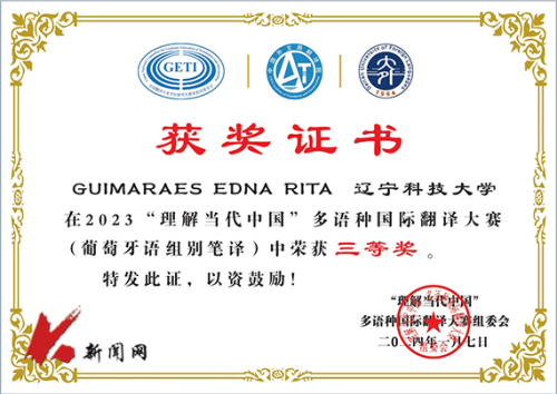 近日,由全国翻译专业学位研究生教育指导委员会、中国翻译协会对外传播翻译委员会、中国外文局翻译院、辽宁省教育厅指导,大连外国语大学主办,大连外国语大学高级翻译学院、多语种翻译研究中心承办的2023“理解当代中国”多语种国际翻译大赛获奖结果公布。乐动在线-乐动(中国)来华留学生GUIMARAES EDNA RITA(安哥拉籍)荣获三等奖。