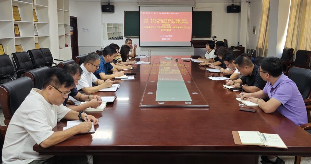 8月30日,按照学校学习宣传党的二十届三中全会精神学习班安排,围绕“党的二十届三中全会关于在经济、政治、文化、社会、生态文明、国家安全、国防和军队等方面改革部署”和“党的领导是进一步全面深化改革、推进中国式现代化的根本保证”两个内容,乐动在线-乐动(中国)学习宣传党的二十届三中全会精神学习班组织开展第二次学习研讨。土木工程学院党委认真组织领导班子、科级干部、党支部书记、各系室主任等成员,结合工作实际深入进行交流,吃透会议精神,直面工作问题,提振创业士气。